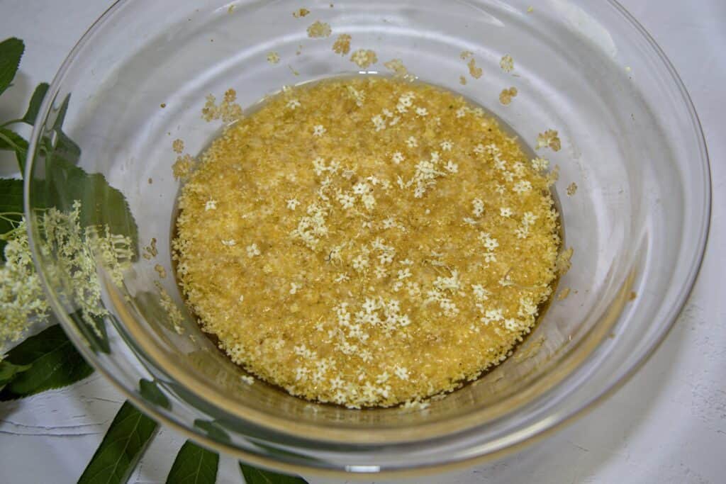 - Place the elderflower heads in a large bowl and pour the apple juice over them.
