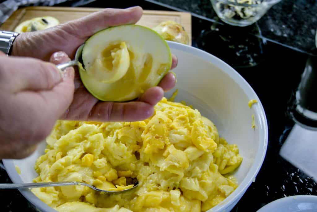 - Wash and cut the pawpaw. Remove the flesh from the fruit by scooping it with a spoon after removing the seeds.