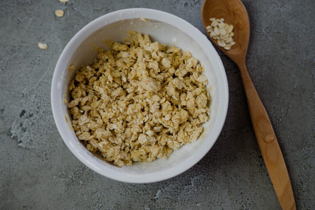 3. Make the Crumble Topping: In another bowl, mix together the flour, rolled oats, brown sugar, salt, and cinnamon (if using). Add the cubed butter and use your fingers to blend the butter into the dry ingredients until the mixture resembles coarse crumbs.