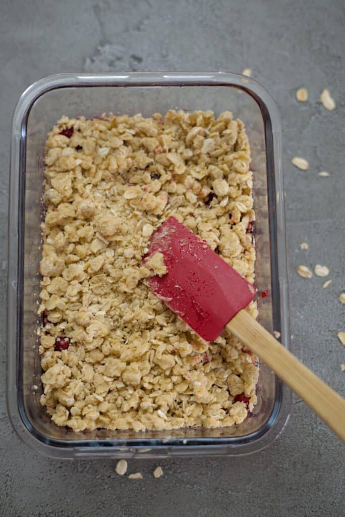 4. Sprinkle the crumble topping evenly over the red currant mixture in the baking dish.